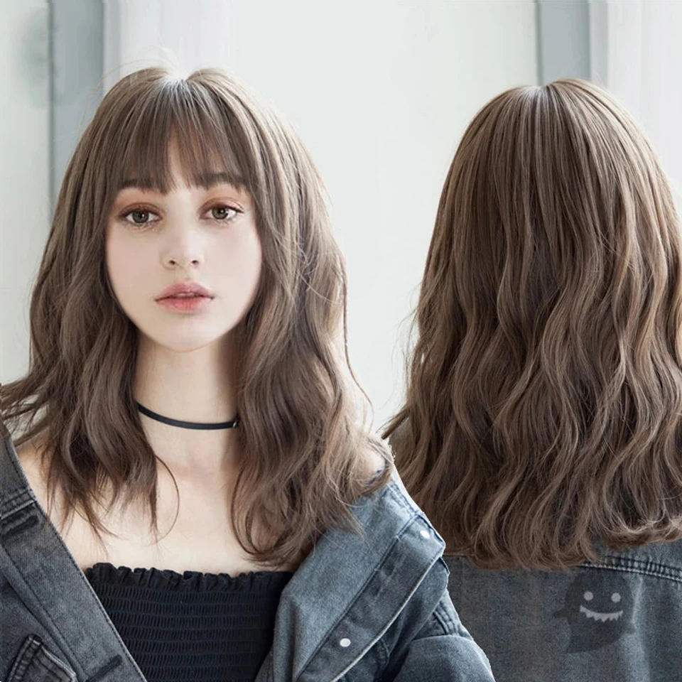 Name: SHANGKE-Peluca de cabello sintético para mujer, cabellera larga de ondas al agua con flequillo, color marrón frío, resistente al calor, corte Bob, Cosplay diario