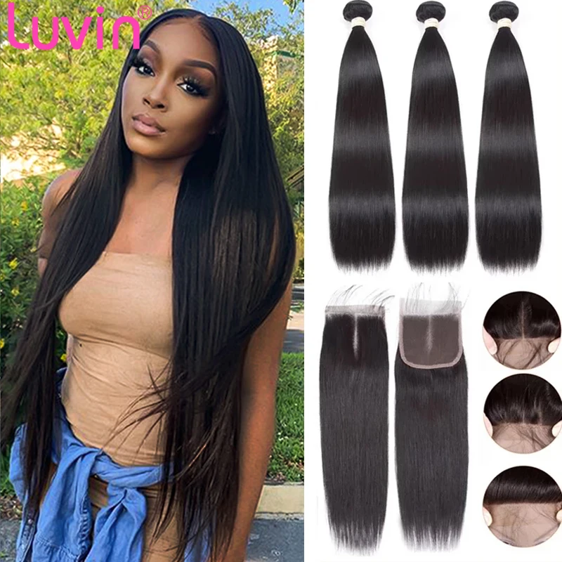 Name: Luvin-mechones de cabello humano postizo brasileño, extensiones de cabello humano liso con cierre frontal de encaje 4X4